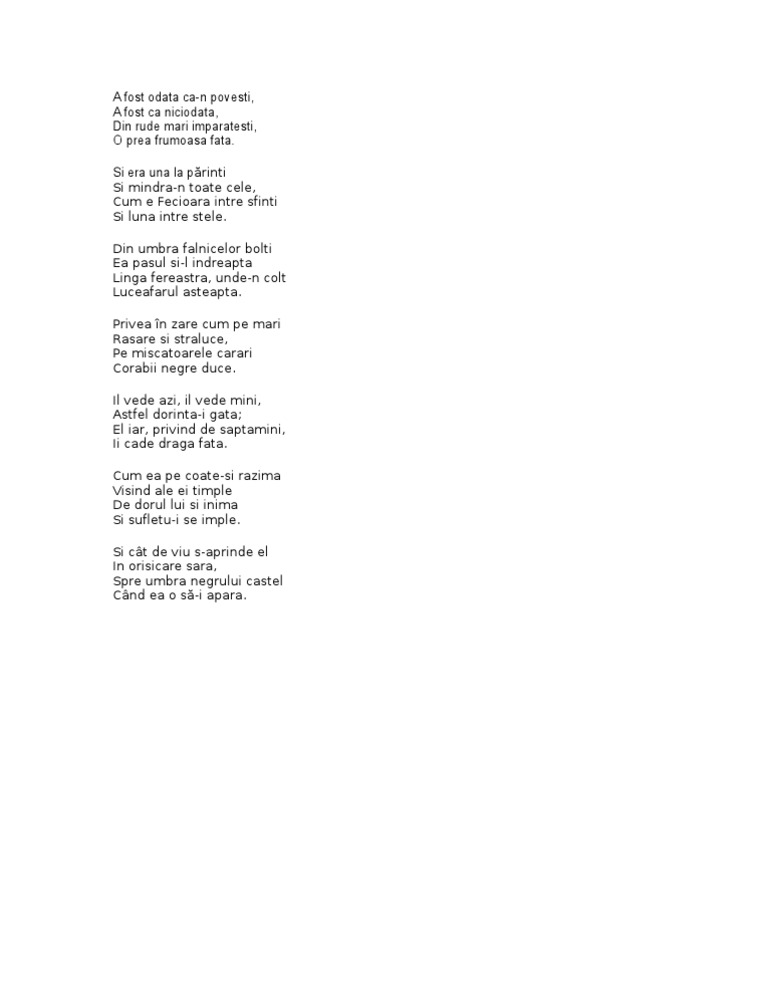 Avea un nas de sapte coti de zgaraia pamantul si o caramida in chiloti sa n o doboare vantul. Din umbra falnicelor bolti ea pasul si l indreapta linga fereastra unde n colt luceafarul asteapta. A fost odata ca niciodata un taram al oilor. Si era una la părinti si mindra n toate cele cum e fecioara intre sfinti si luna intre stele.