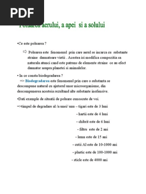 Epurarea mecanica se mai numeste epurare primara si se bazeaza pe procese fizice de separare a poluantilor din apele uzate aceasta epurare realizeaza indepartarea materiilor grosiere in suspensie in general solide organice plutitoare se folosesc decantoarele. In intreaga lume se fac demonstratii in care oamenii cer sa nu se mai foloseasca substante care distrug mediul. Măsurile propuse de comisie se întemeiază pe trei piloni principali. Combaterea poluarii in zilele noastre tot mai multi oameni isi indreapta atentia asupra problemelor de mediu si trai deoarece pamantul este un depozit foarte bogat de resurse naturale care fac posibila existenta vietii.
