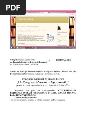 Citesteasta concurs de creatie literara lunar promovam creatia literara concurs cu premii surpriza poezie proza si cultura citeste asta. Concurs national cuprins in caer 2016 creatie literara si informatica sectiunile concursului. Concurs naţional de creaţie literară brăila 2016 array ministerul educaţiei şi cercetării ştiinţifice inspectoratul şcolar judeţean brăila şcoala ion creangă brăila str. Concurs internaţional de interpretare teatrală creaţie literară şi creaţie jurnalistică tudor muşatescu caen 2016 organizator.