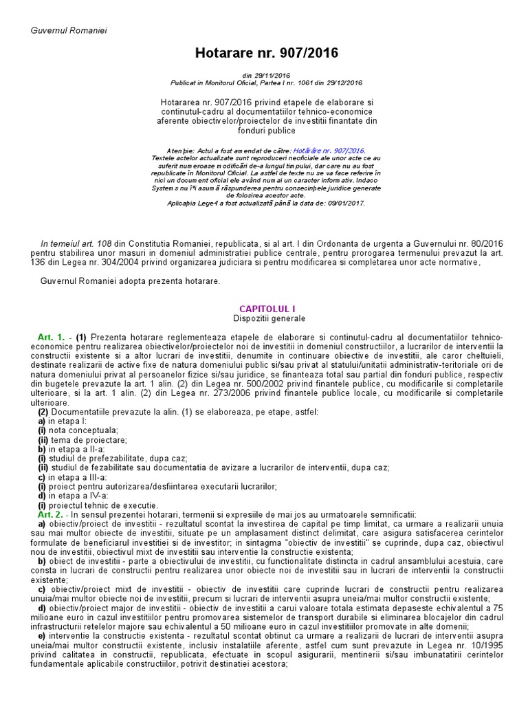 907 2016 din 29 11 2016 publicat in monitorul oficial partea i nr. 108 din constituția româniei republicată și al art. 907 din 29 noiembrie 2016 privind etapele de elaborare şi conţinutul cadru al documentaţiilor tehnico economice aferente obiectivelor proiectelor de investiţii finanţate din fonduri publice forma sintetică la data 04 ian 2017. 1061 din 29 decembrie 2016.
