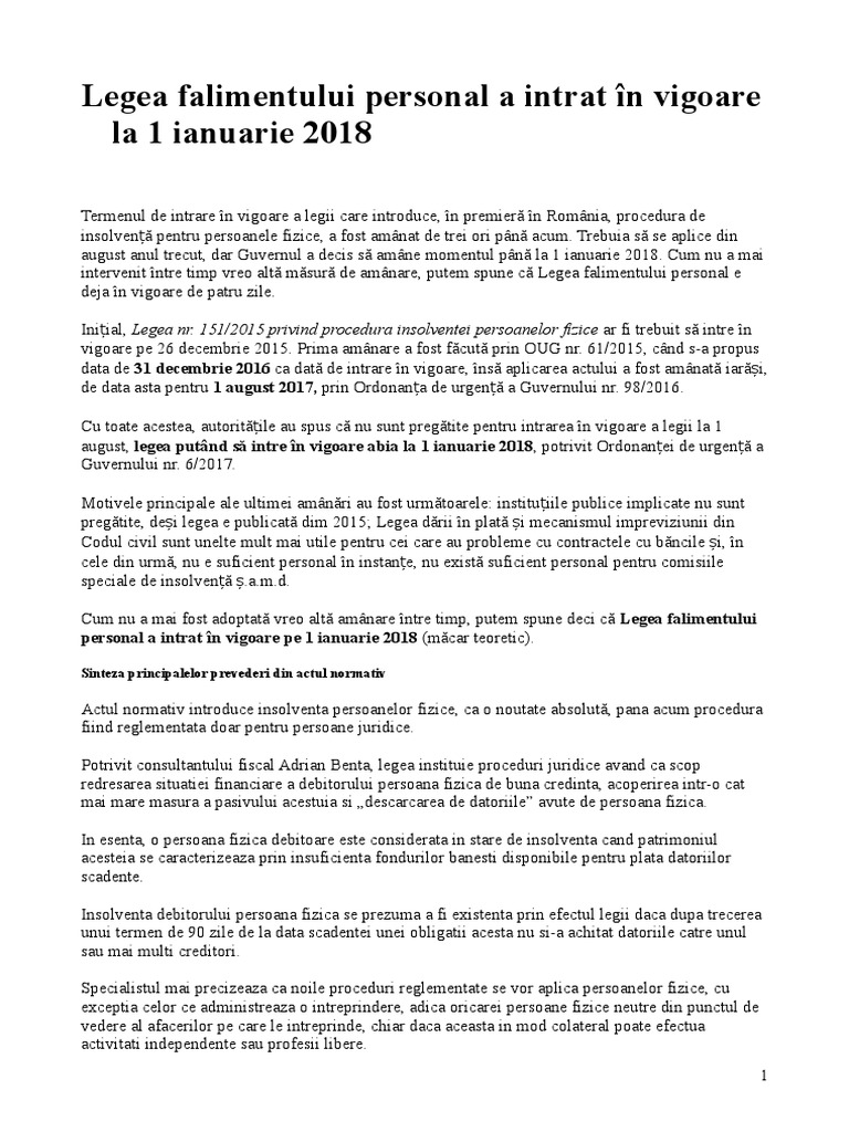 In monitorul oficial din 26 iunie a c. Capitolul i dispozitii generale scopul legii art. Legea insolventei persoanelor fizice 2016 legea insolventei persoanelor fizice nu se mai amana pana anul viitor decizia luata de deputatii juristi comisia juridica din cadrul camerei deputatilor a respins marti propunerea guvernului de a amana aplicarea legii insolventei persoanelor fizice pana la 1 ianuarie 2017. 151 din 18 iunie 2015 privind procedura insolvenţei persoanelor fizice publicată în.