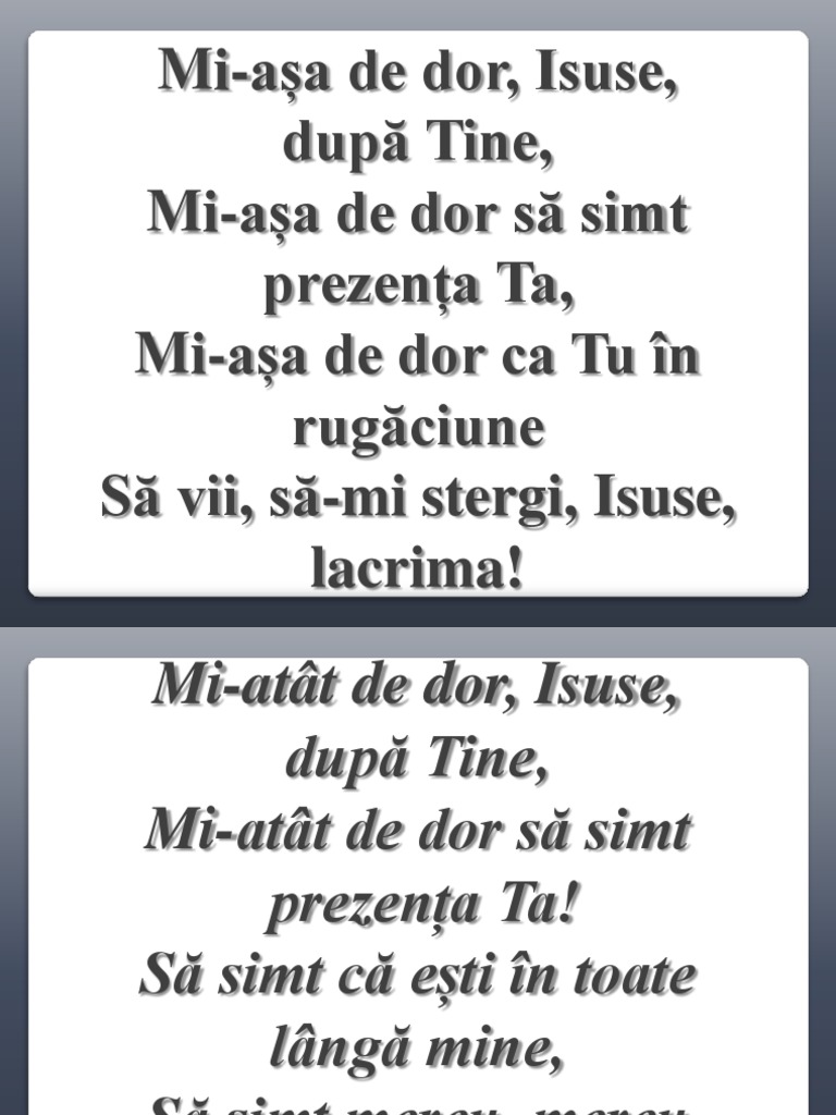 Mi așa de dor ca tu în nopți târzii mi așa de dor isuse să revii. Mi a a de dor isuse dupa tine mi a a de dor sa simt prezen a ta. Te chem să vii la mine şi plâng de dorul tău ce aş face n suferinţă ce aş face la necaz de n ai fi tu să mi mângâi lovitul meu obraz de n ai fi tu cu mine ca mâna să mi întinzi şi n dulcea mângâiere la sân să mă cuprinzi să mi legi atâtea. Mi aşa de dor de tine isuse dumnezeu.