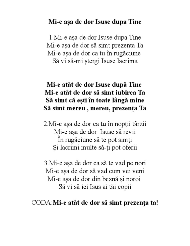 Mi asa de dor de tine versuri. Anonim fara album acorduri. Te chem să vii la mine şi plâng de dorul tău. M am săturat de lume de a ei ademeniri de a ei plăceri de o clipă ce s numai amăgiri. D g d mi asa de dor isuse dupa tine a a7 d mi asa de dor sa simt prezenta ta d g d mi asa de dor ca tu in rugaciune a a7 d sa vi sa mi stergi isuse.