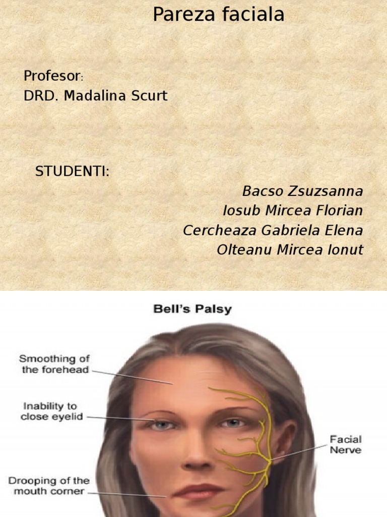 Fara semne de iritatie meningiara pareza faciala stg periferica probele de pareza latenta negative rot declansabile simetrice fara reflexe patologice fara tulburari de sensibilitate sau coordonare constienta. Cele mai frecvente cauze de pareză facială sunt. Tumorile prin efect compresiv direct neurinomul de acustic si prin invazie a osului temporal pot determina pareza faciala periferica s indromul ramsay hunt datorat virusului herpes zoster asociaza parezei faciale si o afectare a nervului viii precum si o eruptie veziculoasa caracteristica la. Paralizia bell este de obicei diagnosticata pe baza anamnezei examenului fizic si examenului neurologic care investigheaza functia nervului facial si elimina eventuale cauze mai grave de paralizie faciala.