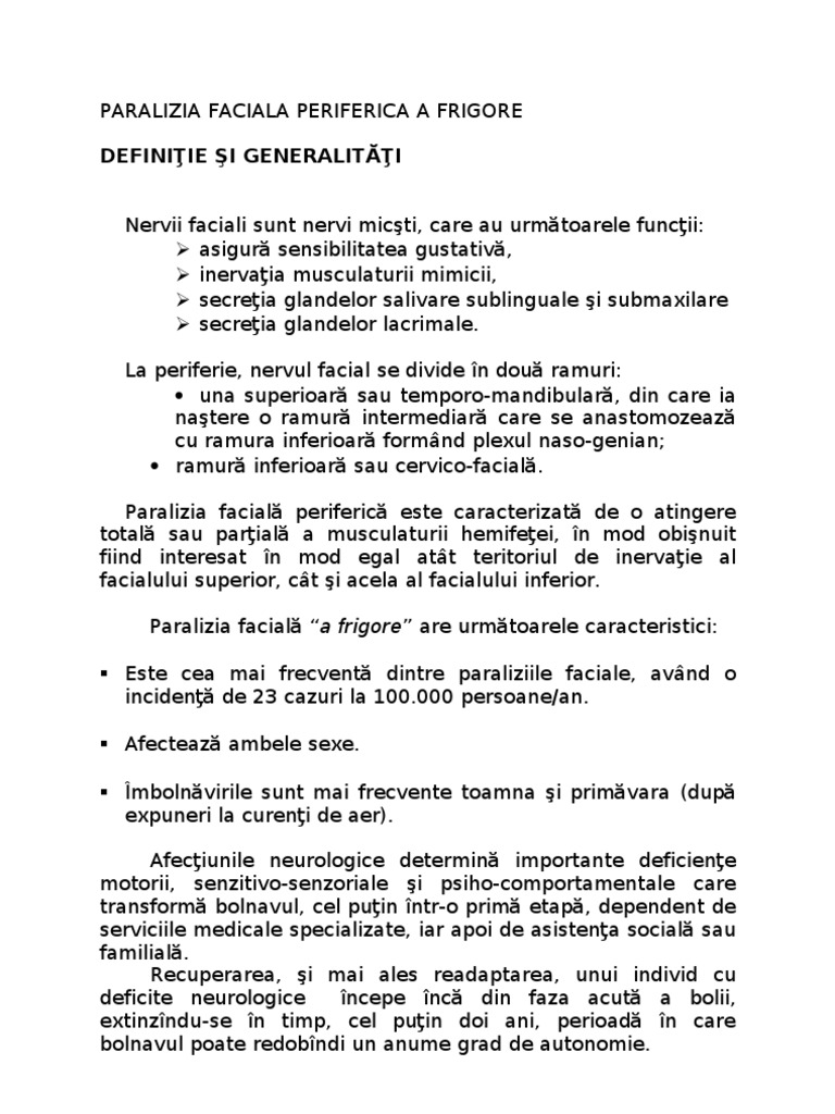 Aceasta poate unilaterală sau bilaterală centrală sau periferică. In urma cu 5 zile am fost diagnosticata cu pareza faciala periferica a frigore.
