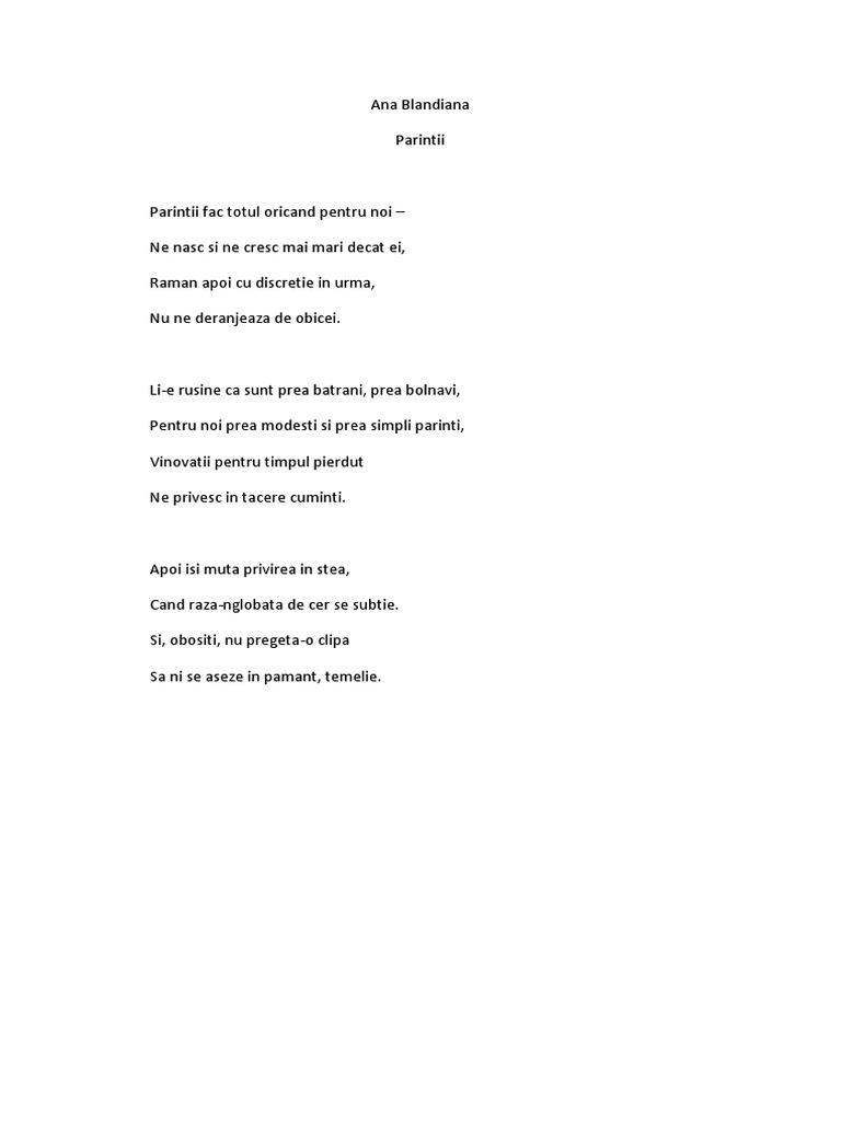 Părinții fac totul oricând pentru noi ne nasc și ne cresc mai mari decât ei rămân apoi cu discreție în urmă nu ne deranjează de obicei. învăţământ liceal limba şi literatura român ă. Poezia parintii de ana blandiana versurile poeziei parintii scrisa de poetul ana blandiana. Părinții de ana blandiana scriitoarea ana blandiana este căsătotită cu romulus rusan și el un scriitor român amândoi fondatori ai memorialului victimelor comunismului şi al rezistenţei situat în municipiul sighetu marmaţiei judeţul maramureş.