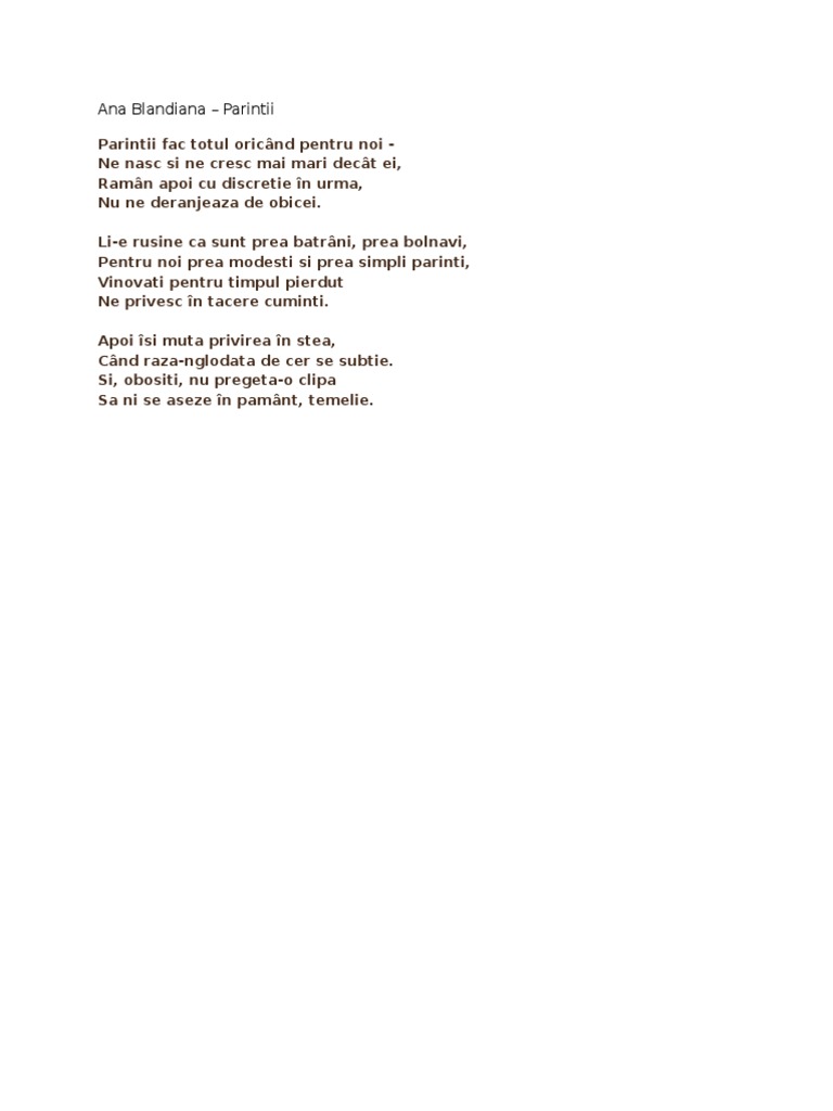 Părinţii fac totul oricând pentru noi ne nasc şi ne cresc mai mari decât ei rămân apoi cu. Roversuri ro litera a ana blandiana poezia parintii de ana blandiana poezia parintii. Versuri ana blandiana parintii mei parintii fac totul oricand pentru noi ne nasc si ne cresc mai mari decat ei raman apoi cu discretie in urma nu ne deranjeaza de obicei. Textul literar părinţii de ana blandiana.