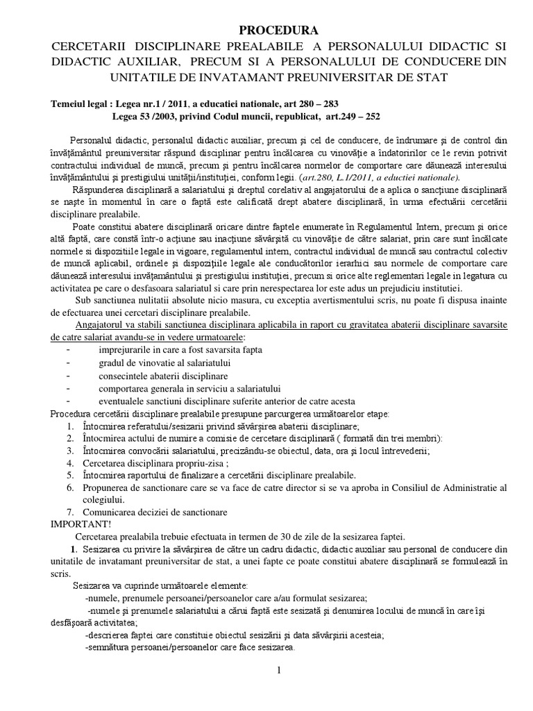 Procedura cercetare disciplinara invatamant. O cercetare disciplinară care sare peste anumite proceduri poate fi contestată de salariat în instanță și așa cum ne au indicat mai mulți specialiști există numeroase procese câștigate de salariați în sensul acesta. 1 înștiințarea conducerii societății cu privire la înfăptuirea unei abateri disciplinare. Angajatatorul va putea demara procedura de cercetare disciplinara respectiv convocarea angajatului dupa revenirea din concediu medical termenul de sanctionare fiind suspendat pe durata incapacitatii temporare de munca. Henri coandă nr 7 personalului tel 0234 552089 fax 0234 552011 email.
