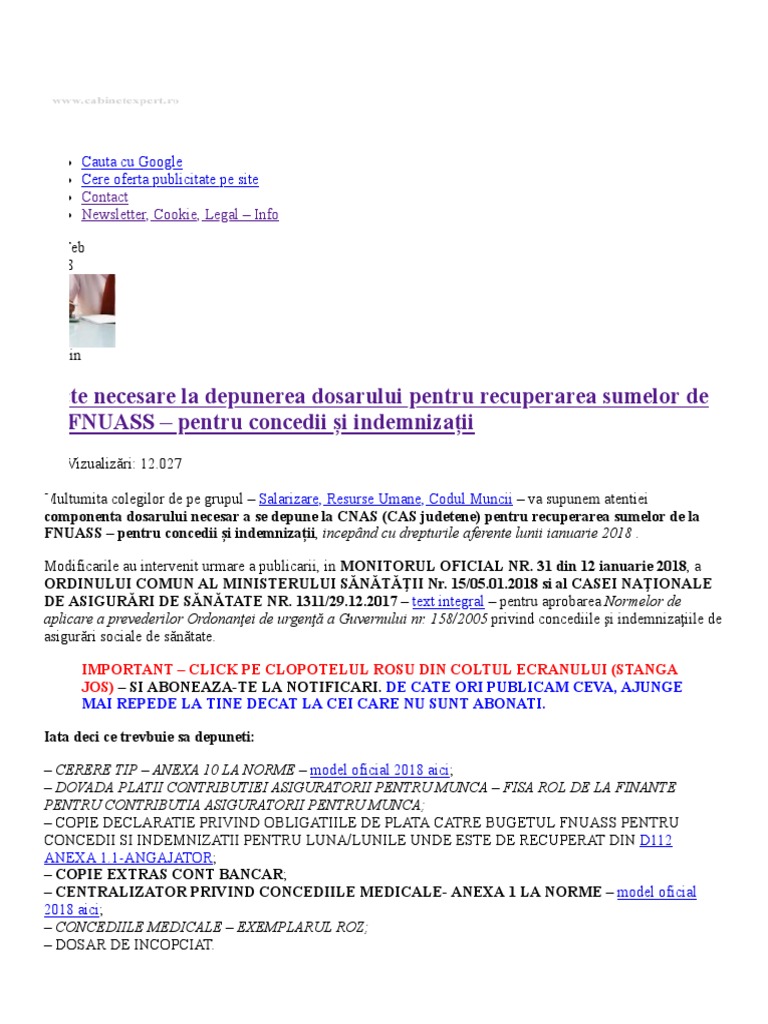 158 2005 privind concediile si indemnizatiile de asigurari sociale de sanatate aprobate prin ordinul ministrului sanatatii si al presedintelui casei nationale de asigurari de sanatate nr. Cererea de recuperare a sumelor pentru concedii medicale completată în două exemplare. Multumita colegilor de pe grupul salarizare resurse umane codul muncii va supunem atentiei componenta dosarului necesar a se depune la cnas cas judetene pentru recuperarea sumelor de la fnuass pentru concedii și indemnizații incepând cu drepturile aferente lunii ianuarie 2018. Modificarile au intervenit urmare a publicarii in monitorul oficial nr.