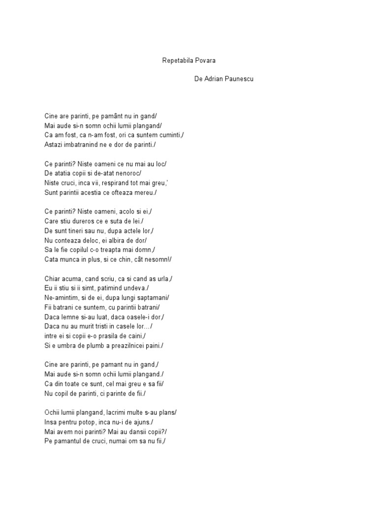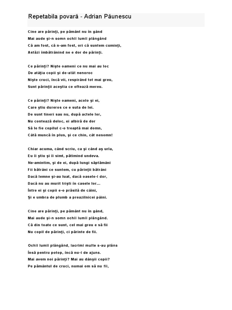 Repetabila povară de adrian păunescu. Versuri adrian păunescu repetabila povara. Repetabila povară cine are părinţi pe pământ nu în gând mai aude şi n somn ochii lumii plângând că am fost că n am fost ori că suntem cuminţi astăzi îmbătrânind ne e dor de părinţi. Repetabila povară riscul poeziei politice apare într o ediţie nouă repetabila povară.