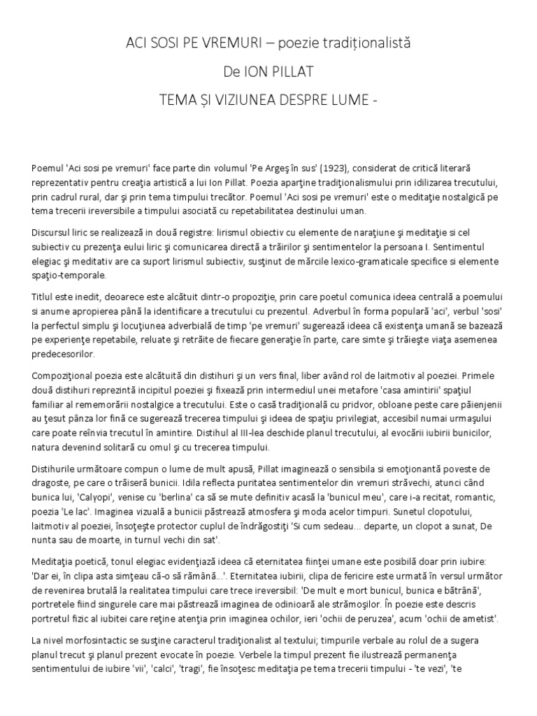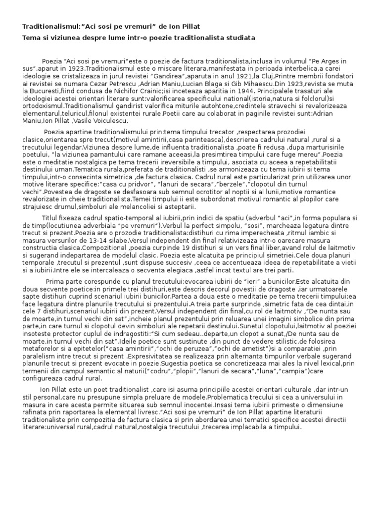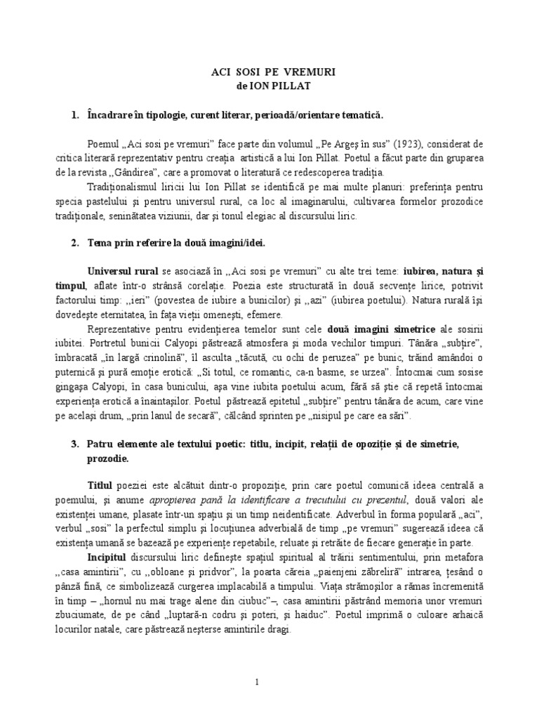 Aci sosi pe vremuri de ion pillat este o poezie de factură tradiţionalistă inclusă în ciclul trecutul viu care face parte împreună cu ciclul florica din volumul pe argeş în sus apărut în 1923. Tema si semnificatiile titlului. Tema poeziei priveste mai multe aspecte universul rural specific traditionalismului asociindu i se doua teme de larga circulatie iubirea si timpul universul rural este ales drept cadru al concretizarii iubirii care este traita in doua planuri temporare trecutul iubirii bunicilor si prezentul iubirii nepotului. Tema si viziunea despre lume.