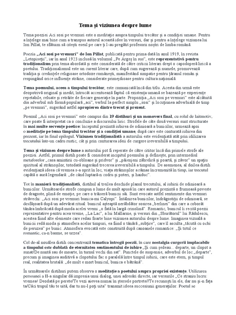 Pentru a înțelege mai bine cum a transpus autorul această idee în versuri dar și pentru a înțelege viziunea lui ion pillat te sfătuim să citești eseul pe care ți l au pregătit profesorii noștri de limba română. Aci sosi pe vremuri. Poezia aci sosi pe vremuri este de factur tradiionalist inclus n volumul pe. Tema si viziunea despre lume aci sosi pe vremuri 1 mai 2019 de staff editorial on pillat este unul dintre cei mai reprezentativi poeți din perioada interbelică inceputul secolului xx prevede o luptă importantă între curentele literare.